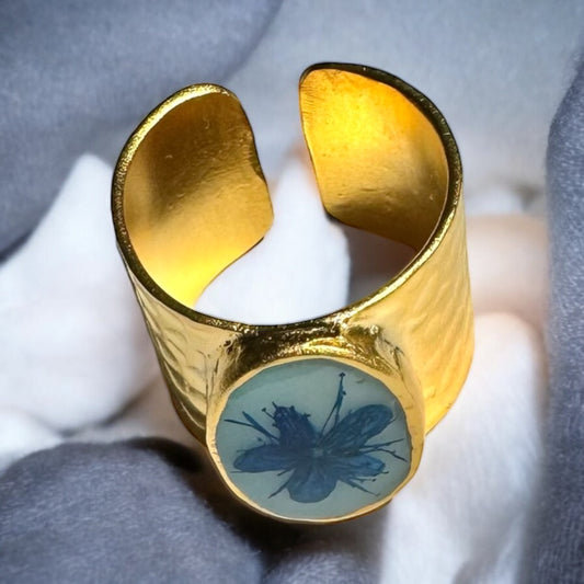 Circular gold plated ring with blue flower