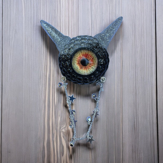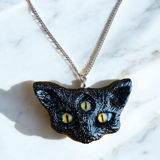 3 eyed cat head necklace, black with silver glitter