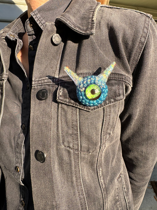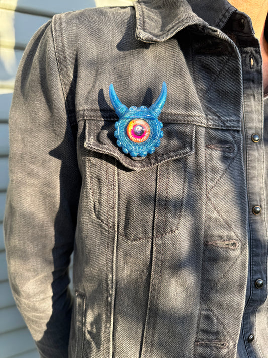 Blue monster brooch with pink skull iris. Model Vicky.
