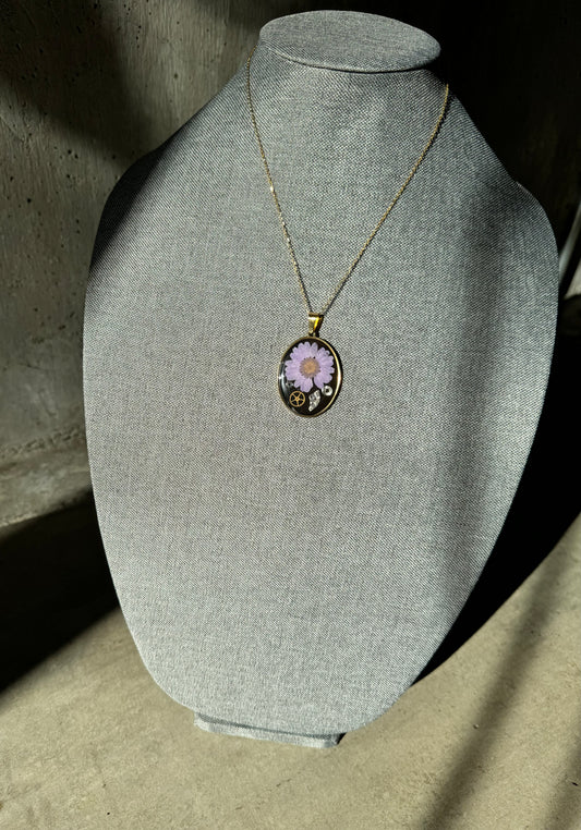 Oval necklace with purple daisy and watch parts