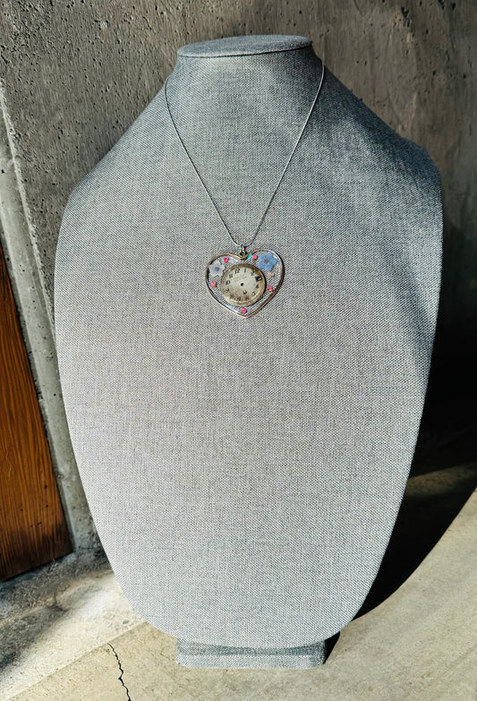 Large heart shape necklace with blue chrysanthemum and watch gear
