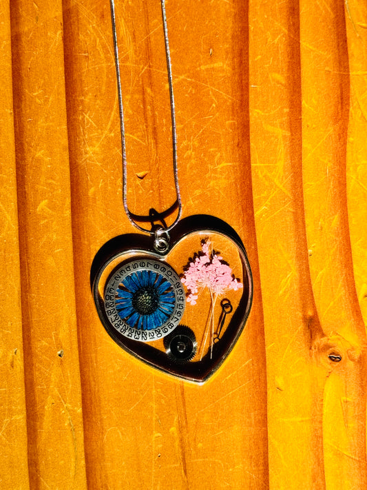 Large heart shape necklace with pressed flowers and watch gear