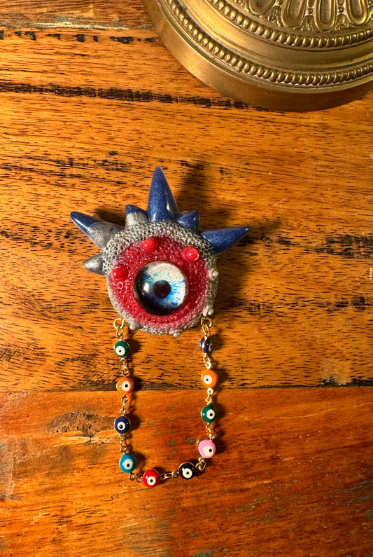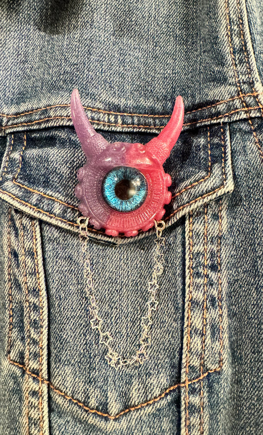 Goth brooch,edgy unique handmade brooch in resin, monster eye jewelry, blue, pink and silver. Model Spiky.