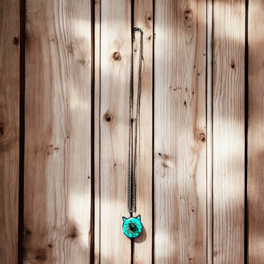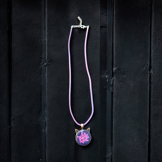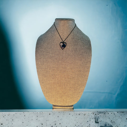 Black Heart necklace with blue chrysanthemum and pink Queen Anne lace flowers and watch parts