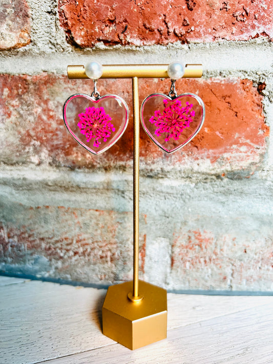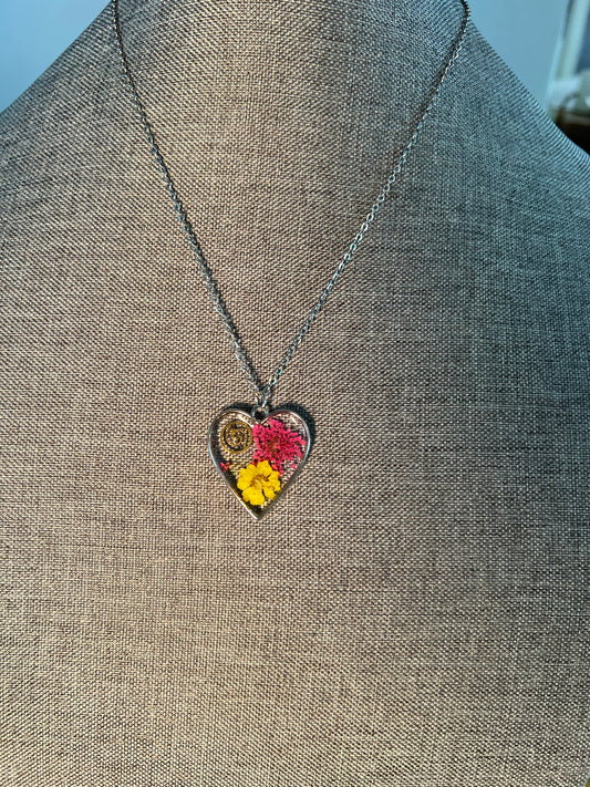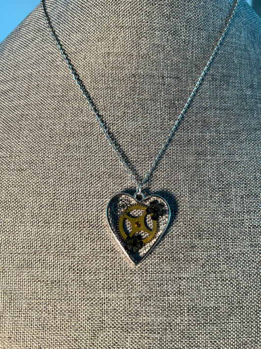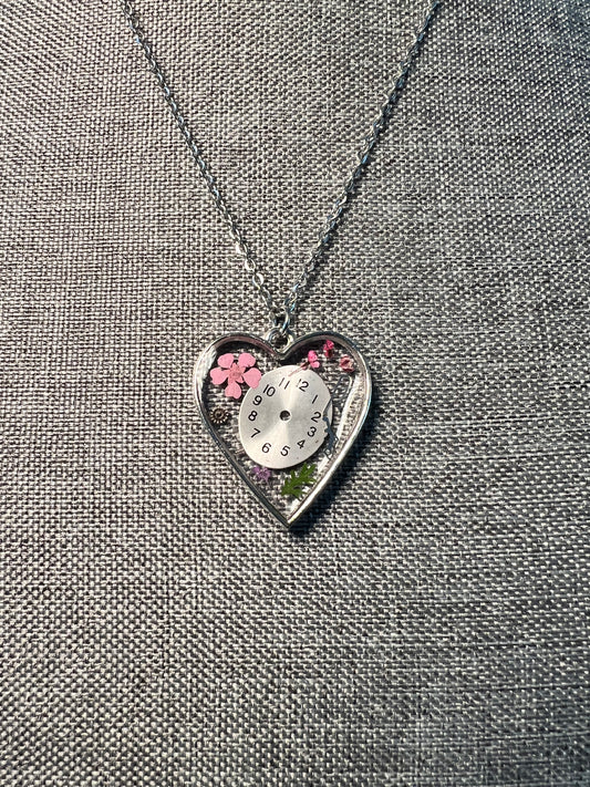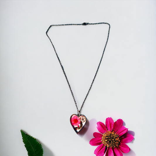Large heart shape necklace with pink daisy, white Queen Anne lace and watch gear