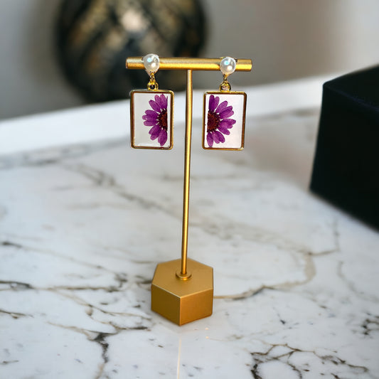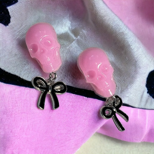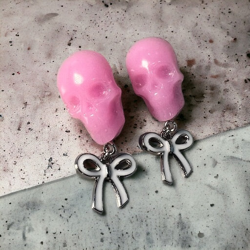 Bubblegum Skull with purple bow and silver metal earrings studs