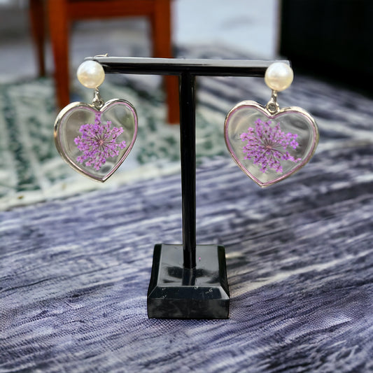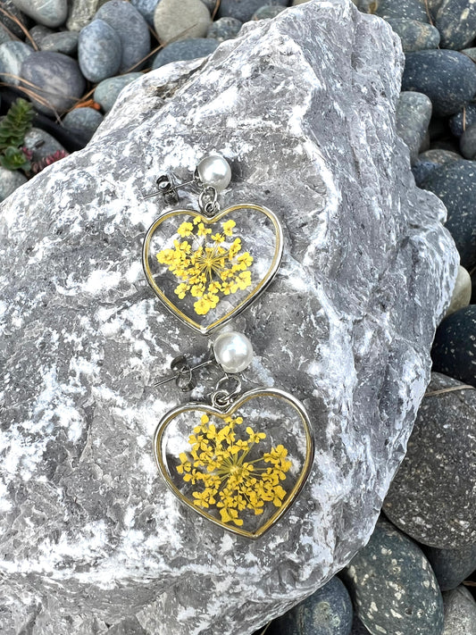 Black Heart necklace with purple and yellow Queen Anne lace flowers and watch part