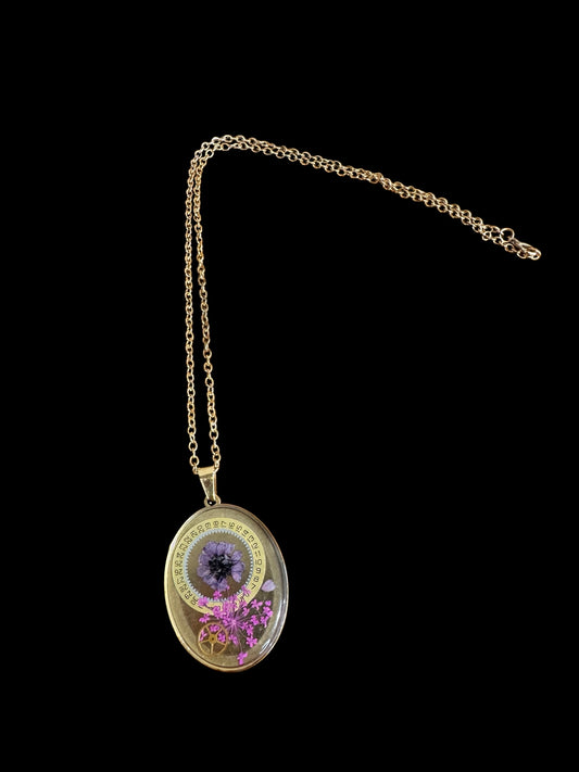 Oval necklace with purple and pink flowers and watch parts