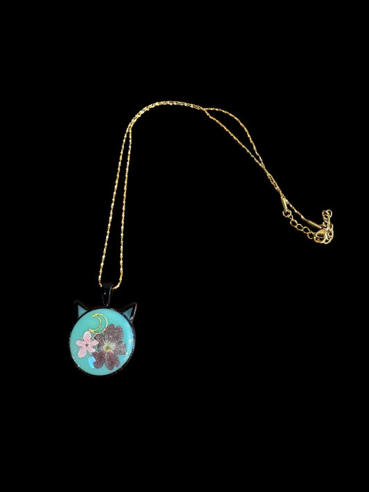 Cat head necklace with pink and purple flowers and moon