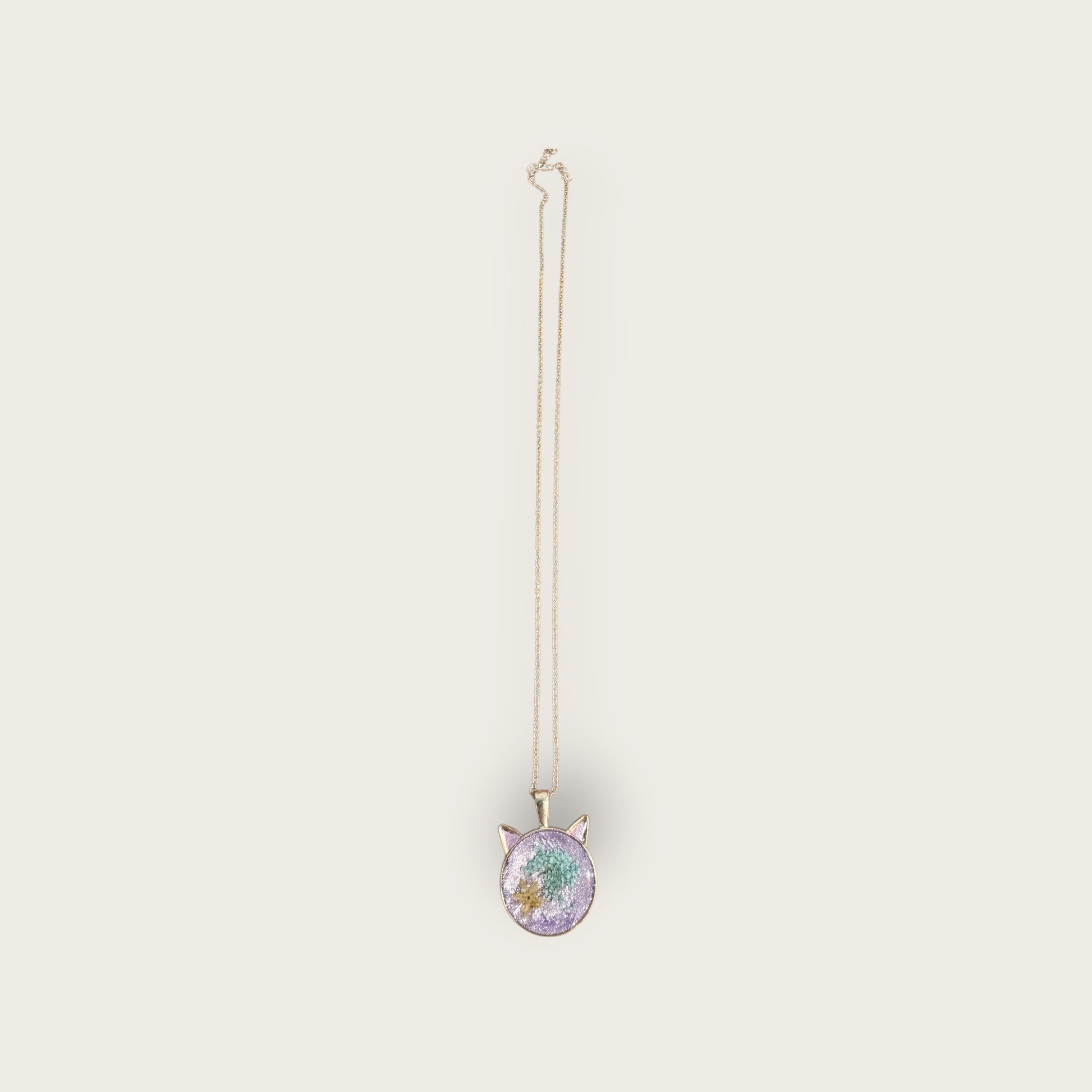 This unique handmade necklace features a silver cat shaped pendant with a beautiful flower set in resin.