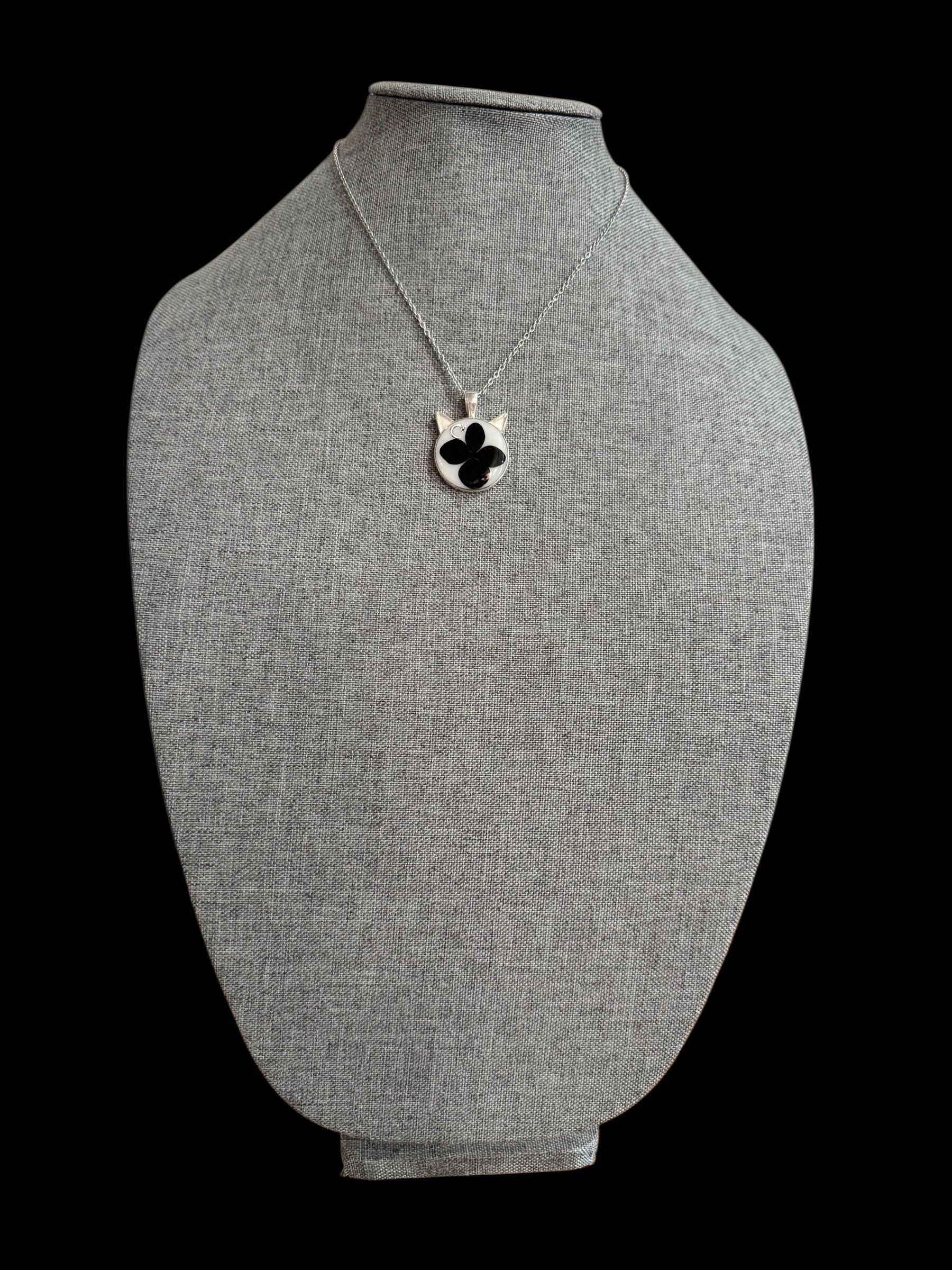 This unique handmade necklace features a silver cat shaped pendant with a beautiful black hydrangea and a moon charms set in resin on a white background.