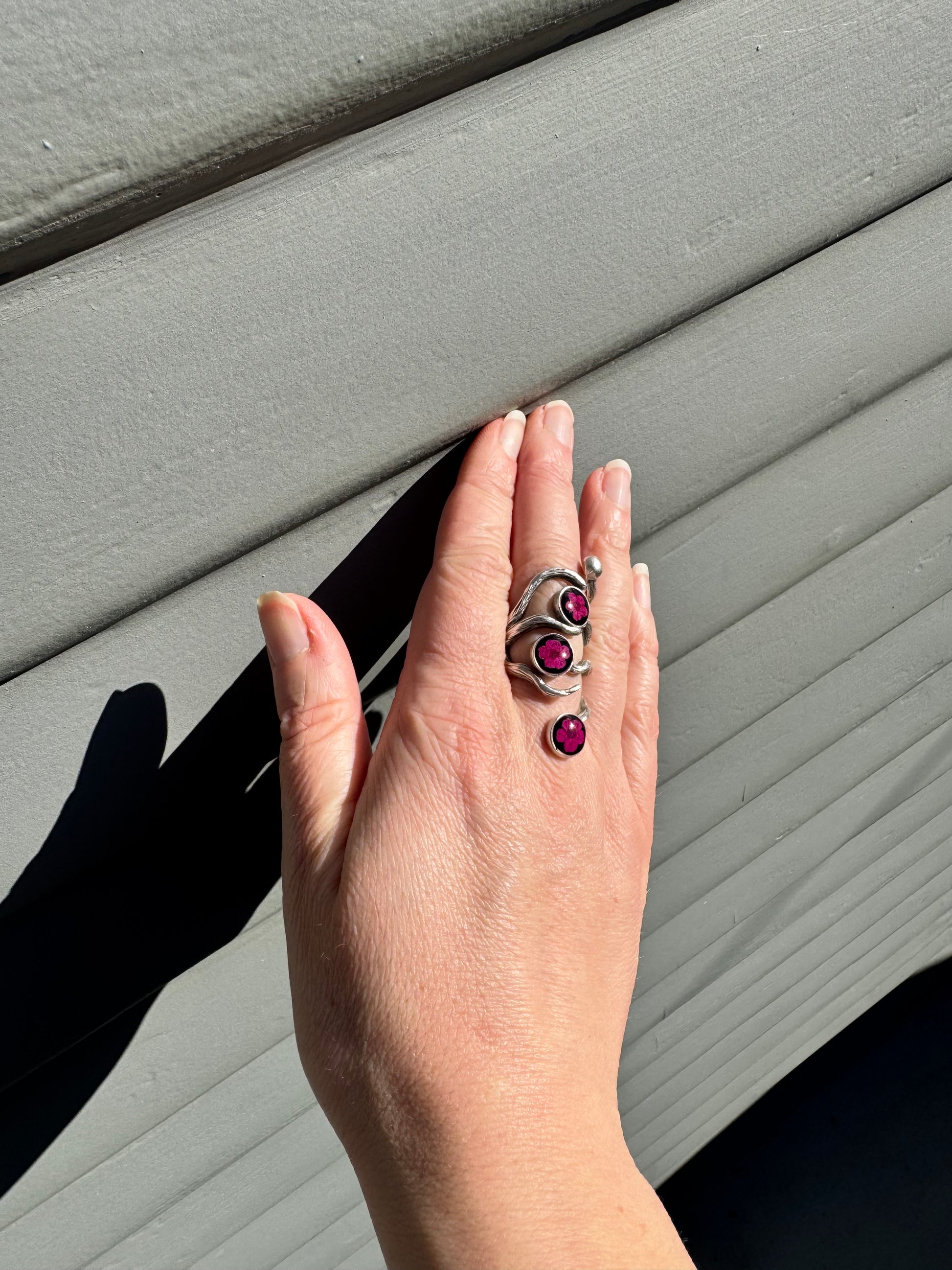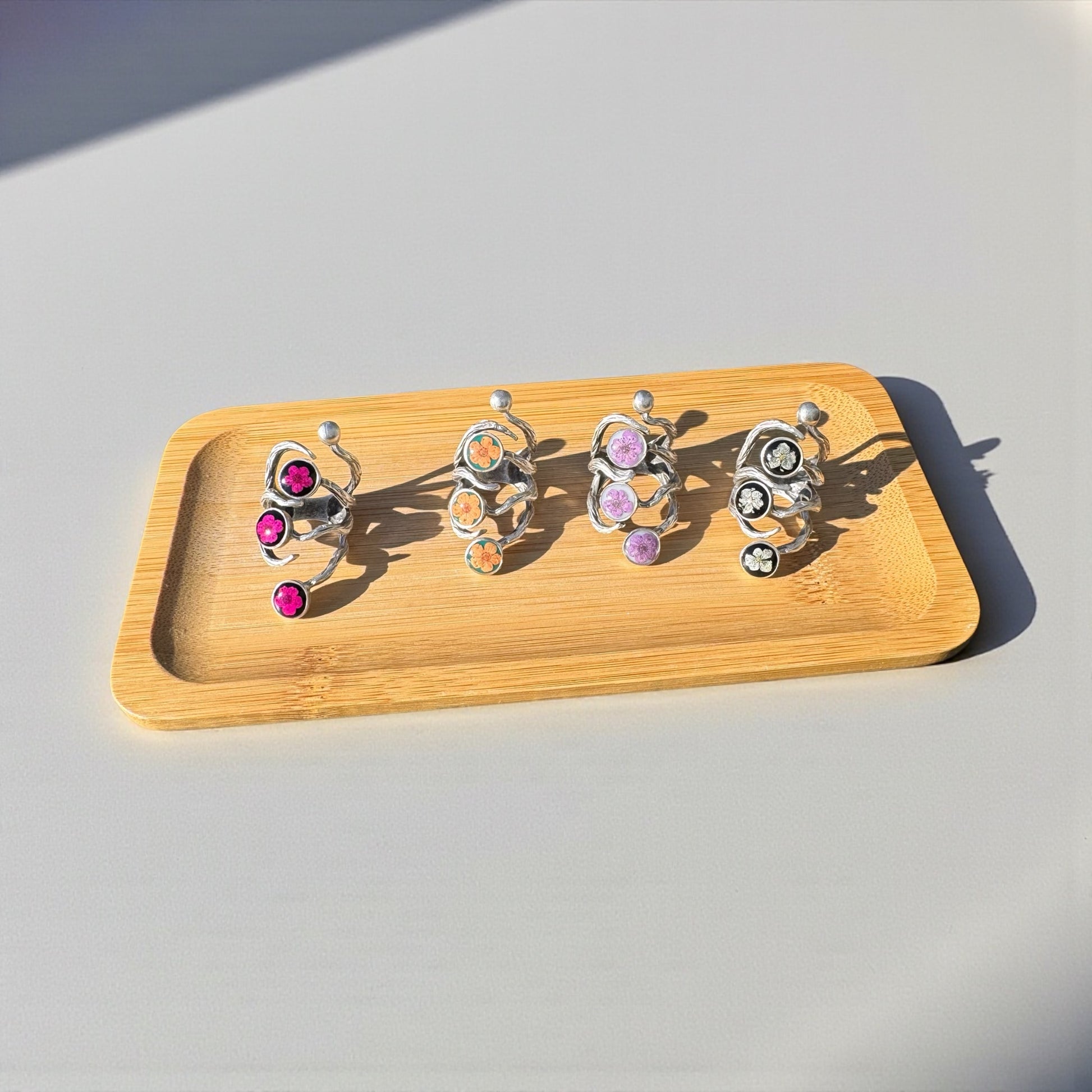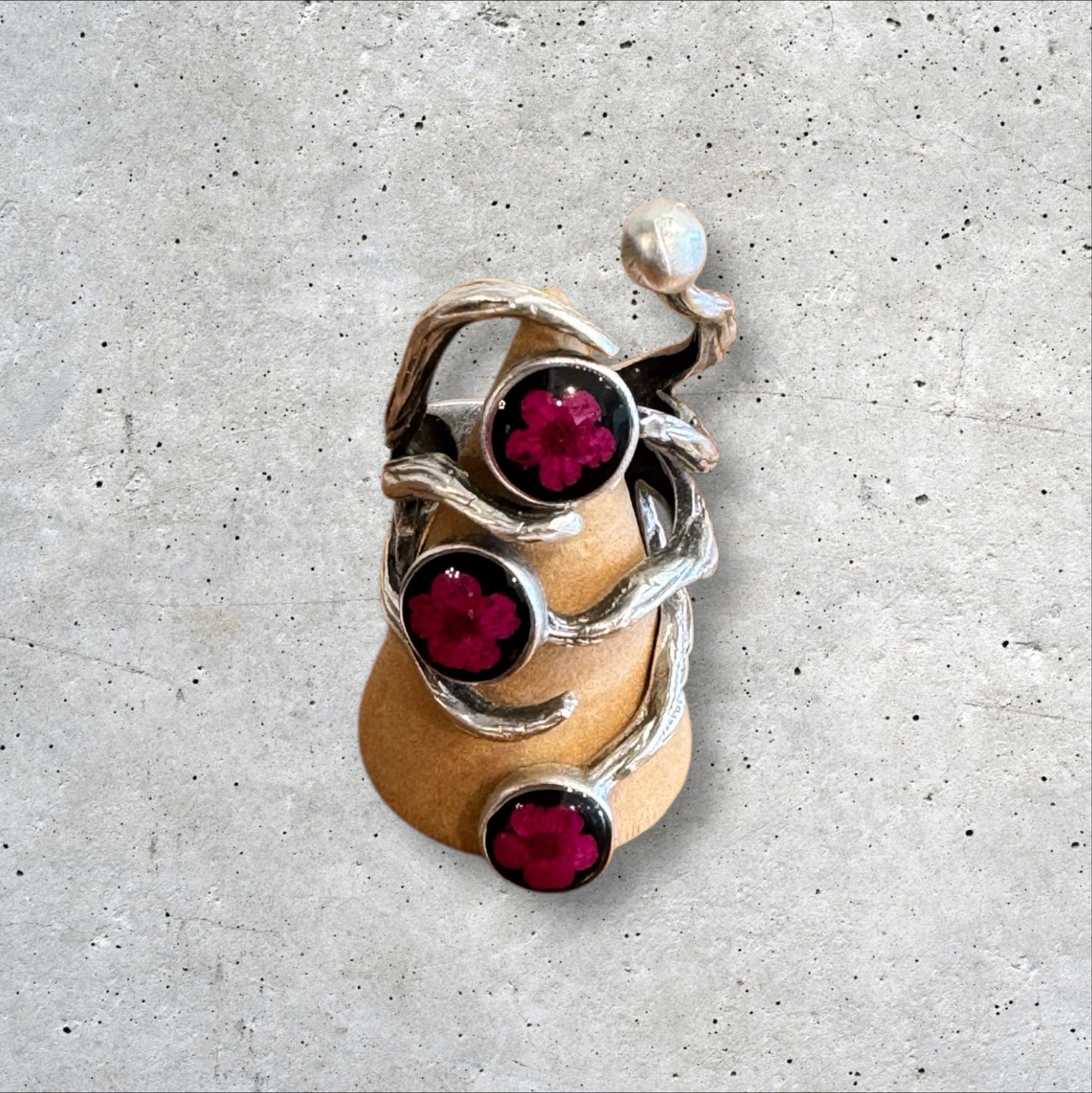This silver plated statement ring features pink narcissus flowers in an intricate roots design on a black background, making it a unique and eye-catching piece. Enjoy the beauty of nature with this elegant and stylish accessory.