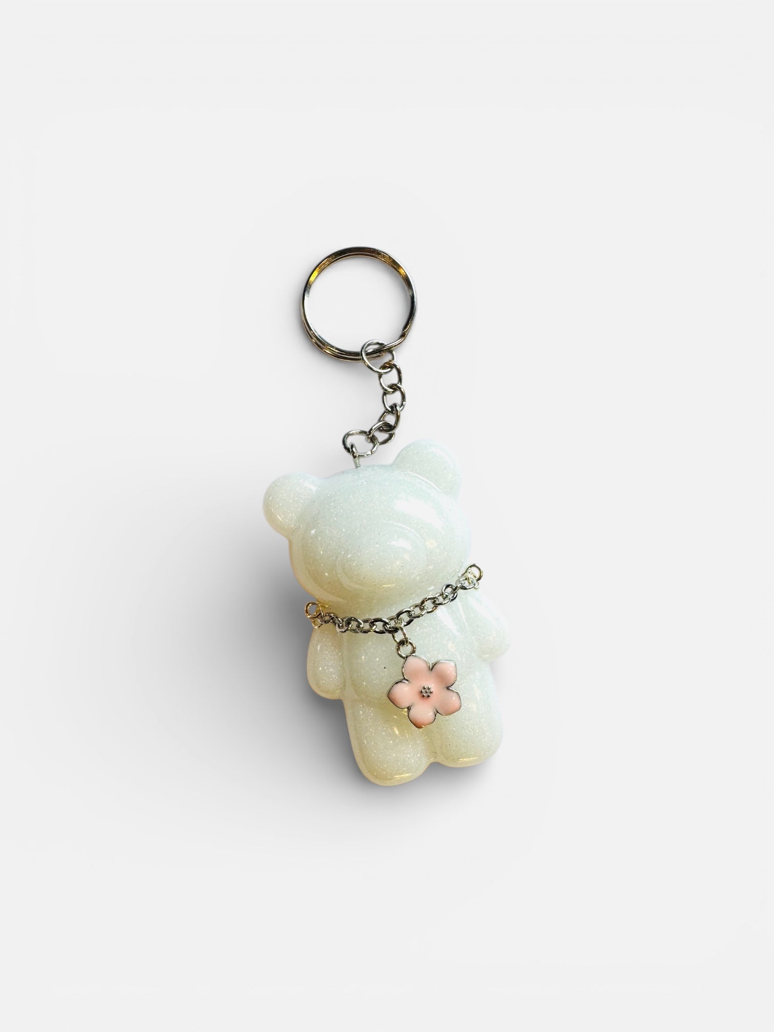 Handmade resin gummy bear keychain with a playful, colorful design. Features a white glittery body with an adorable pink flower chain necklace detail. The fun, eye-catching style makes it perfect for anyone who loves cute accessories, Y2K aesthetics, or just wants to add some personality to their keys or bag.